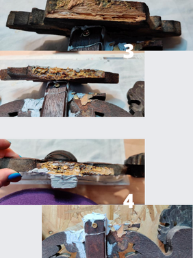 - Miroir brisé, remplacé et recouvert à l'arrière d'une contreplaque teintée au brou de noix.